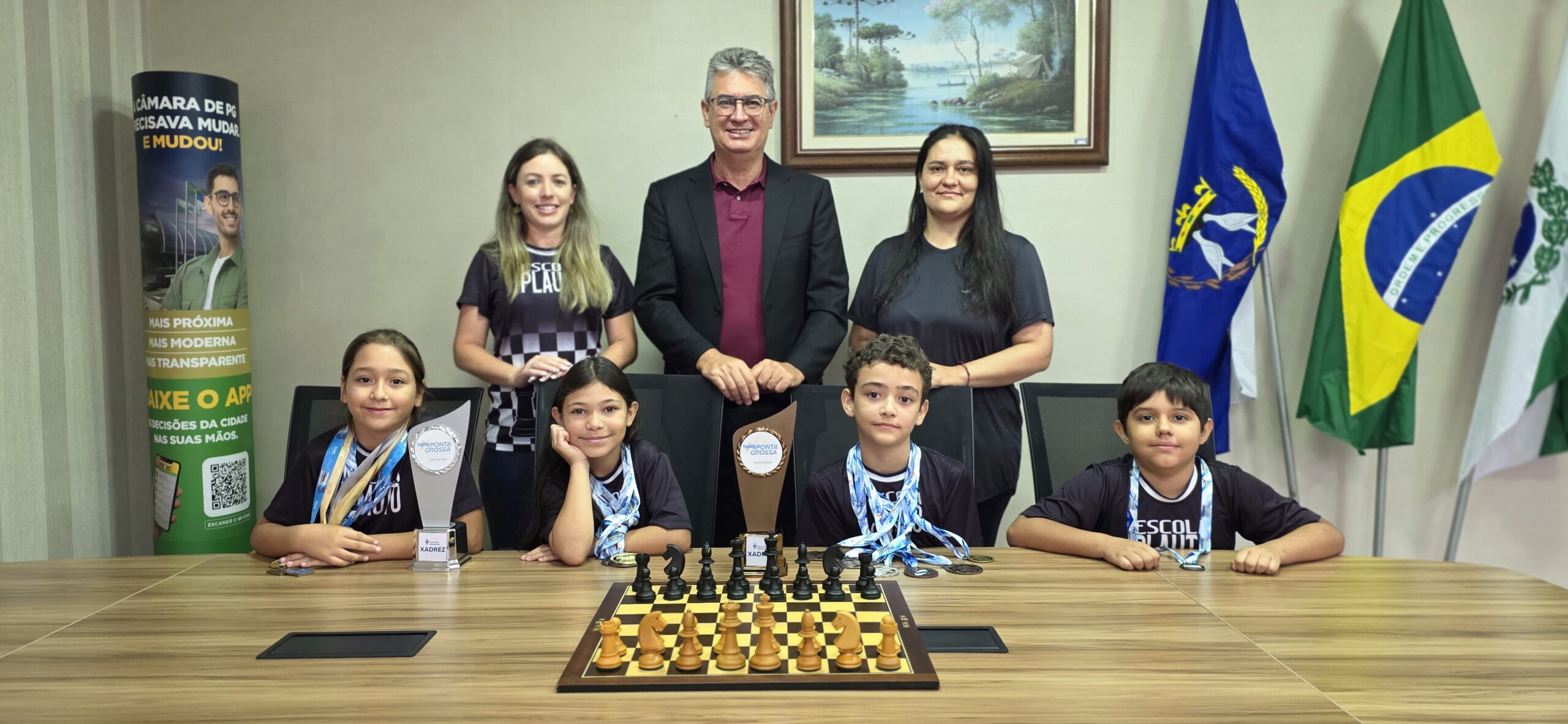 O presidente da Câmara Municipal de Ponta Grossa, Julio Kuller (PL), recebeu nesta semana em seu gabinete, os alunos da Escola Municipal Dr. Plauto Miró Guimarães. Os estudantes são destaques no Campeonato Paranaense de Xadrez, na categoria sub – 10.