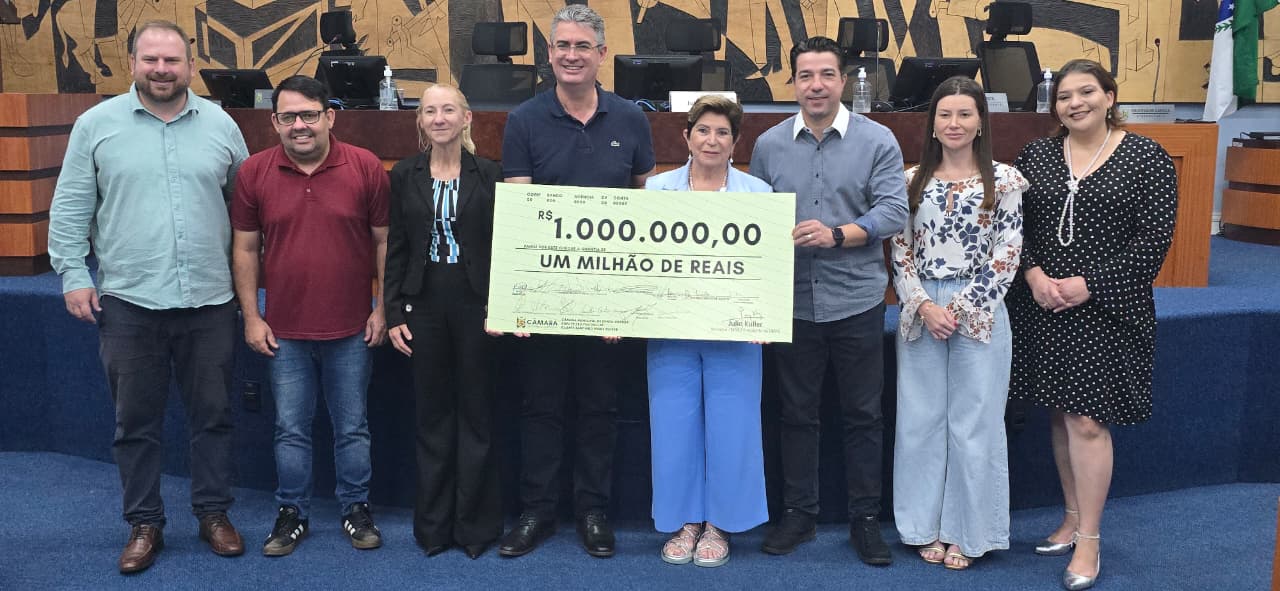 A entrega foi feita no plenário da câmara municipal, com a presença da prefeita Elizabeth Schmidt e do presidente do Legislativo, vereador Julio Kuller, e dos vereadores Guilherme Mazer, Careca, Teka dos Animais, Leandro Bianco, Joce Canto e Enfermeira Marisleidy.