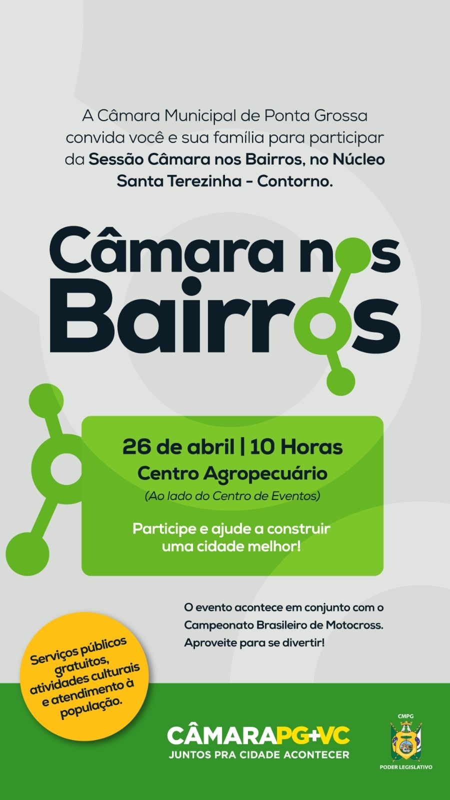 Dessa vez, o Câmara nos Bairros iniciará pela manhã devido ao fato de neste final de semana, Ponta Grossa receber a segunda etapa do Campeonato Barsileiro de Motocross, que será realizado neste final de semana no Centro de Eventos.