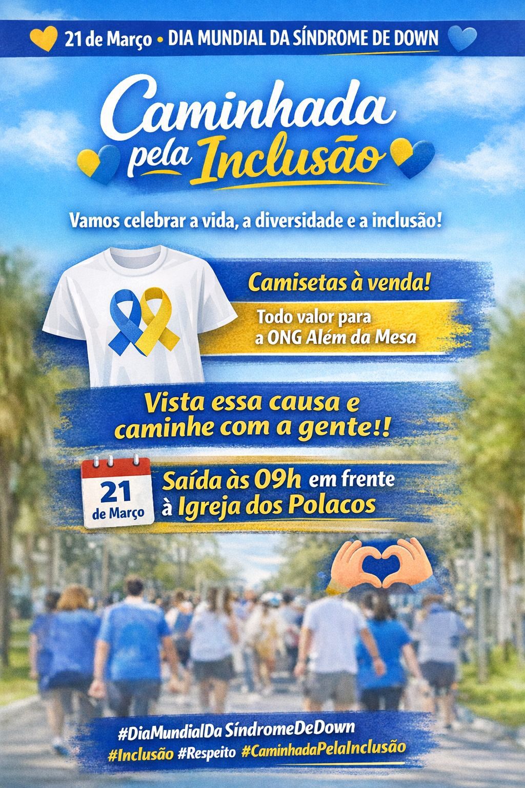 Ocorrerá no próximo sábado (21), a Caminhada pela Inclusão, em prol do Dia Mundial da Síndrome de Down, que será celebrada neste sábado. O objetivo é conscientizar às pessoas sobre a importância da causa, visando uma maior inclusão das pessoas com deficiência na sociedade, que ainda enfrentam muitas barreiras para se inserirem no meios social.