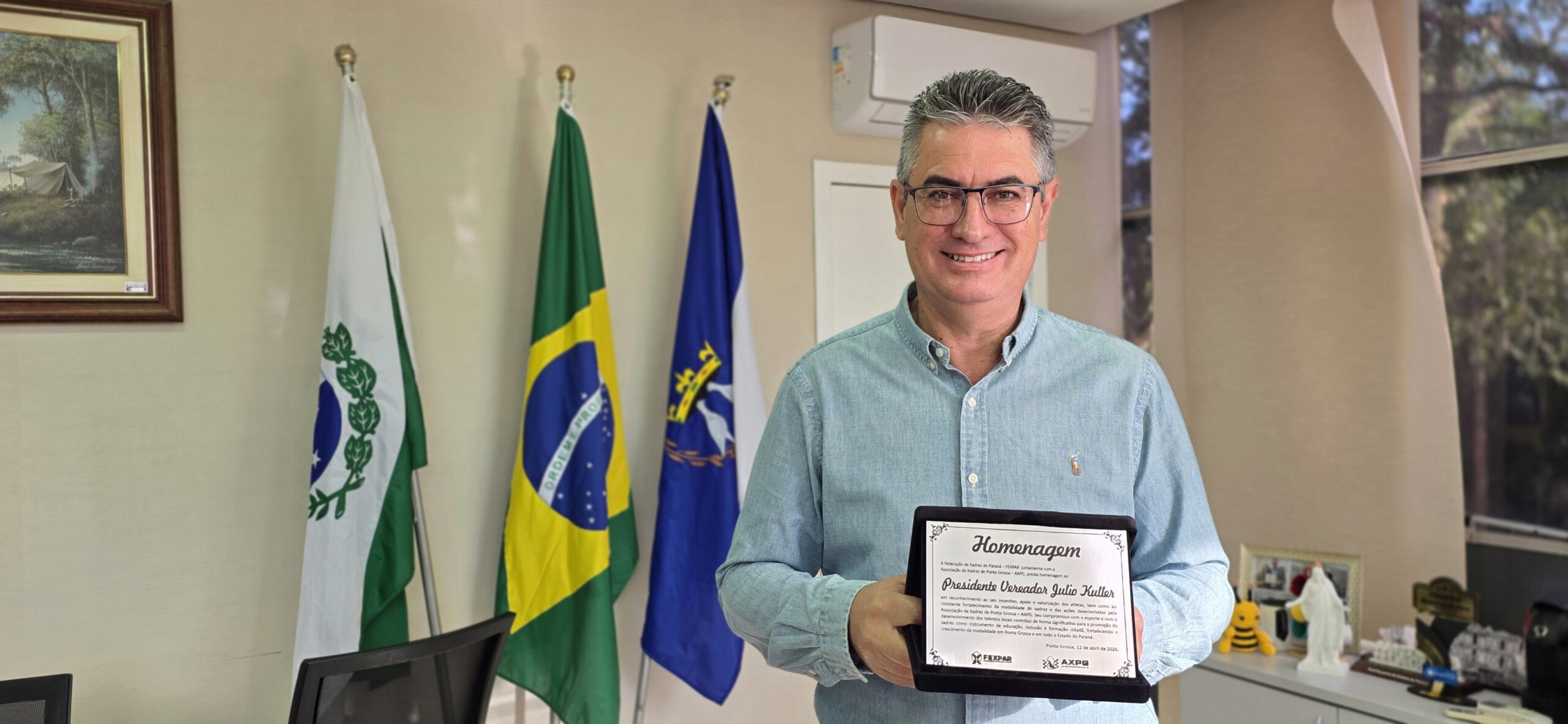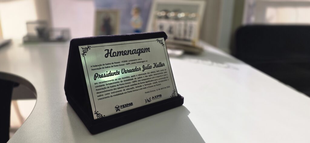 O presidente da Câmara Municipal, Julio Kuller (PL), recebeu na manhã de hoje uma placa de homenagem, da Federação de Xadrez do Paraná (FEXPAR) e da Associação de Xadrez de Ponta Grossa (AXPG), como reconhecimento pelo seu incentivo à modalidade, contribuindo na valorização dos atletas e no fortalecimento das competições.