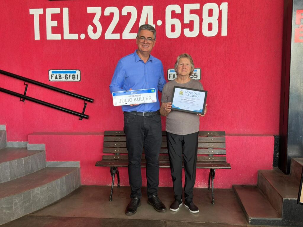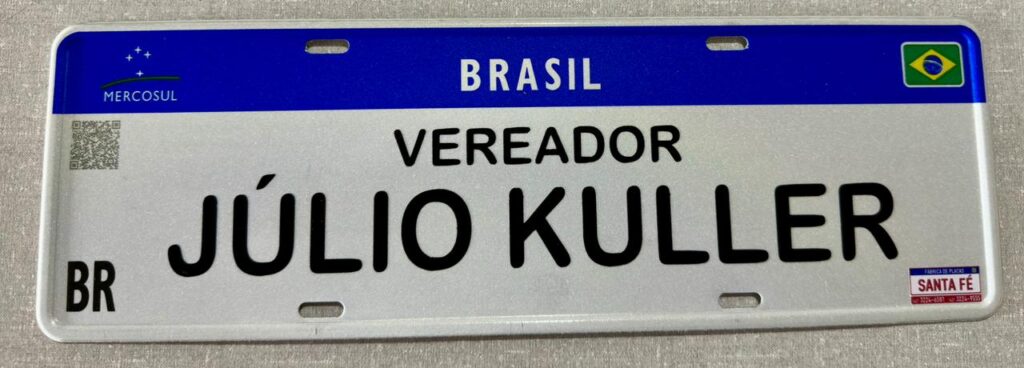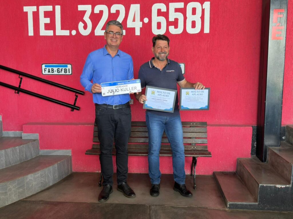 O presidente da Câmara Municipal de Ponta Grossa, Julio Kuller (PL), recebeu nesta manhã de quinta – feira (16), uma placa com seu nome, como forma de homenagem da fábrica de placas Santa Fé, localizada no bairro Nova Rússia.