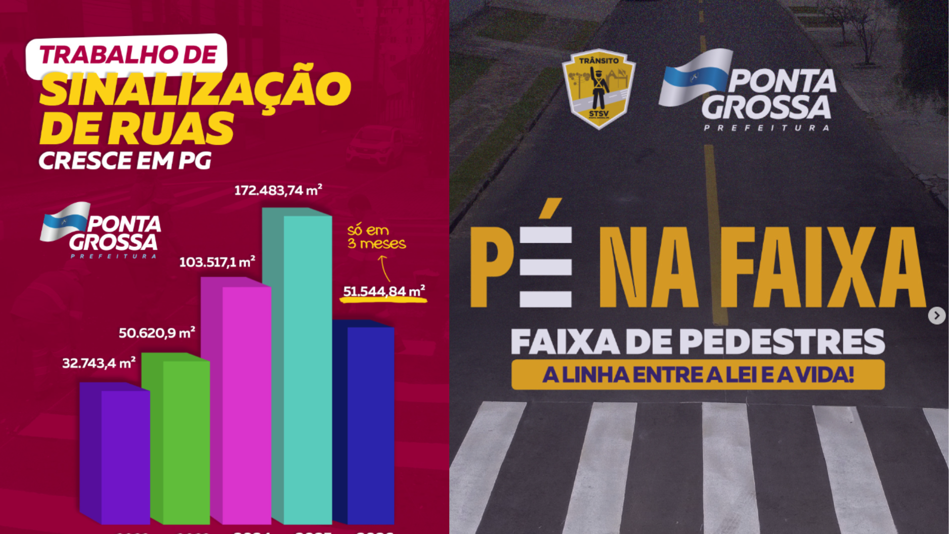 A Prefeitura de Ponta Grossa segue investindo cada vez mais na sinalização das ruas do município, fortalecendo a segurança e a circulação de pedestres e motoristas. Somente nos primeiros três meses de 2026, já foram sinalizados mais de 51 mil metros quadrados. Este número, já é a terceira maior metragem de sinalização desde 2022.