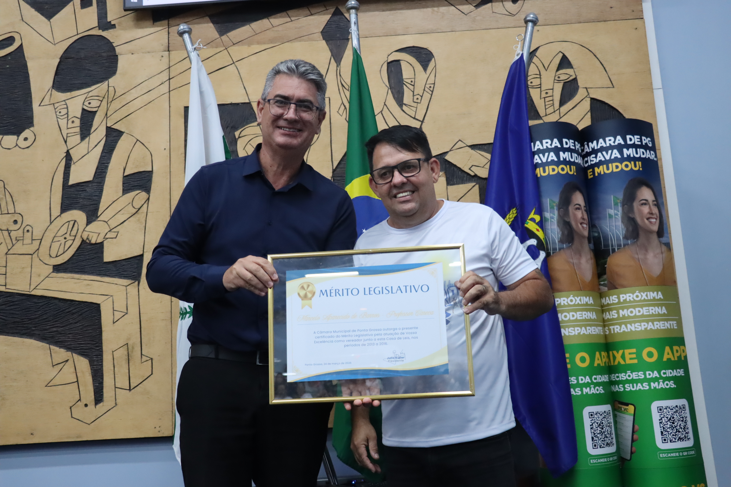 O vereador Professor Careca (PV) foi homenageado nesta segunda – feira (13), com a entrega do Mérito Legislativo, em reconhecimento de suas contribuições feitas para a cidade de Ponta Grossa, durante seu mandato de vereador. O Mérito Legislativo é uma proposta feita pelo presidente da Câmara, Julio Kuller (PL), para homenagear os ex – vereadores da cidade.