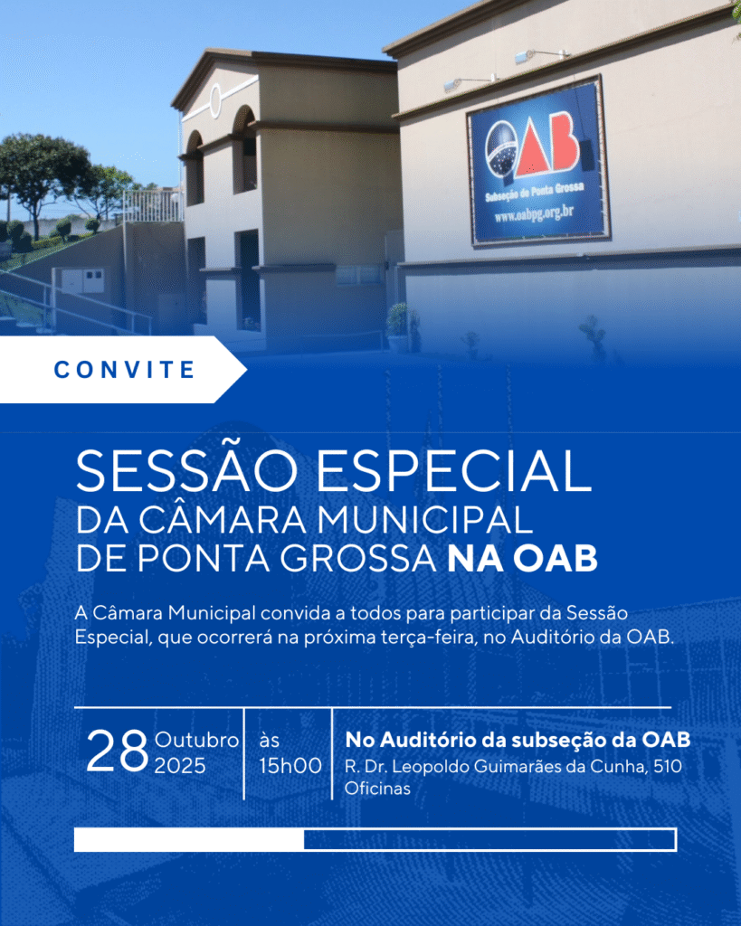 A Câmara Municipal de Ponta Grossa realizará na próxima terça – feira (28), uma sessão especial no auditório da Ordem dos Advogados do Brasil (OAB), no bairro Oficinas, às 15h. O projeto Câmara Especial já ocorreu em outras instituições da cidade, o presidente da Câmara, Julio Kuller (MDB), comentou a importância de levar o poder legislativo, para além de sua sede “A Câmara Municipal de Ponta Grossa precisa trabalhar em conjunto com as instituições da nossa cidade. Os desafios de Ponta Grossa exigem que estejamos unidos” Em relação à escolha do local para o evento, Kuller explicou que se deve ao fortalecimento dos valores democráticos da sociedade, como a soberania popular “A OAB é a ‘Casa da Cidadania’ de Ponta Grossa. Ao trazer a Câmara para cá, estamos dizendo que o Poder Legislativo quer fortalecer seus alicerces naquilo que é mais importante: a cidadania, a lei e o diálogo.”, explicou. Além da OAB, o evento já ocorreu na UEPG, UTFPR e na ACIPG. A sede da OAB de Ponta Grossa fica na rua Dr. Leopoldo Guimarães da Cunha, n° 50. A sessão é aberta ao público