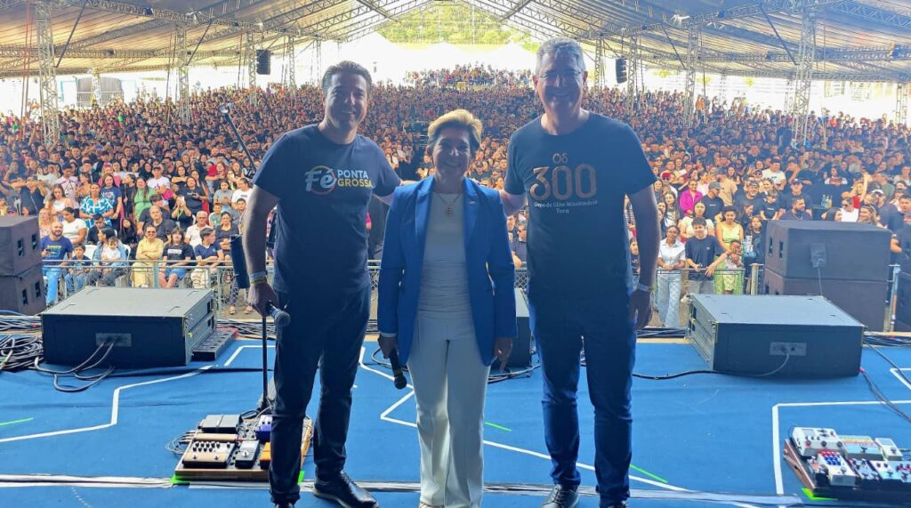 O domingo (14) foi marcado por um grande momento de fé e união em Ponta Grossa, com a realização da 1ª Feira Cristã dos Campos Gerais — Fé Ponta Grossa. O evento, que acontece no Centro de Eventos até esta segunda-feira (15), tem reunido milhares de pessoas em um ambiente de louvor, música e espiritualidade. Entre os presentes, estiveram o presidente da Câmara Municipal de Ponta Grossa, vereador Julio Küller (MDB), a prefeita Elizabeth Schmidt (União Brasil) e o vereador Pastor Leandro Bianco (Republicanos), que acompanharam a programação ao lado do público, reafirmando o apoio institucional a eventos que promovem valores cristãos, solidariedade e cultura. “É emocionante ver tanta gente reunida com um só propósito: celebrar a fé. Este evento mostra a força da nossa comunidade e como a fé também movimenta a cidade”, destacou Julio Küller. A prefeita Elizabeth também elogiou a iniciativa. “A Feira Cristã é mais do que um evento musical. É um espaço de união, oração e solidariedade, com entrada solidária de 1kg de alimento, ajudando quem mais precisa”, disse. A programação segue nesta segunda-feira (15), com shows de Theo Rubia e Isaías Saad, além de apresentações de bandas locais. A entrada é gratuita, mediante a doação de 1kg de alimento não perecível.
