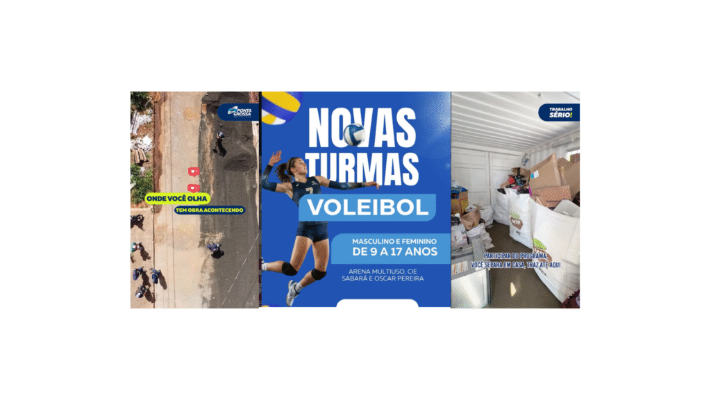 A prefeitura de Ponta Grossa vem realizando uma série de obras de infraestrutura nas ruas do município, como recuperação de asfalto da Vila Estrela, Contorno, ampliação de galerias no bairro Nova Rússia, para água das chuvas, além de outras obras de manutenção. Este é um dos maiores investimentos já realizados na melhora das ruas em nossa cidade. A Secretária Municipal de Esportes, está com as inscrições abertas para as novas turmas de voleibol, a prática esportiva é destinada a crianças e jovens entre 9 a 17 anos. As aulas são gratuitas e serão realizadas em três locais da cidade: ginásio Oscar Pereira, Arena Multiuso e CIE Sabará. As inscrições podem ser feitas online no site da secretária. O Recicla PG está recebendo lixos recicláveis, a cada destinação correta do material, você acumula pontos, que resultam em benefícios ou visitas à empresas parceiras. Os dejetos podem ser entregues no Parque Ambiental e na praça Simón Bolívar, em Oficinas. Entre os produtos que podem serem entregues estão: óleo usado, papel plástico, PET, alumínio, vidro, entre outros.